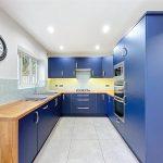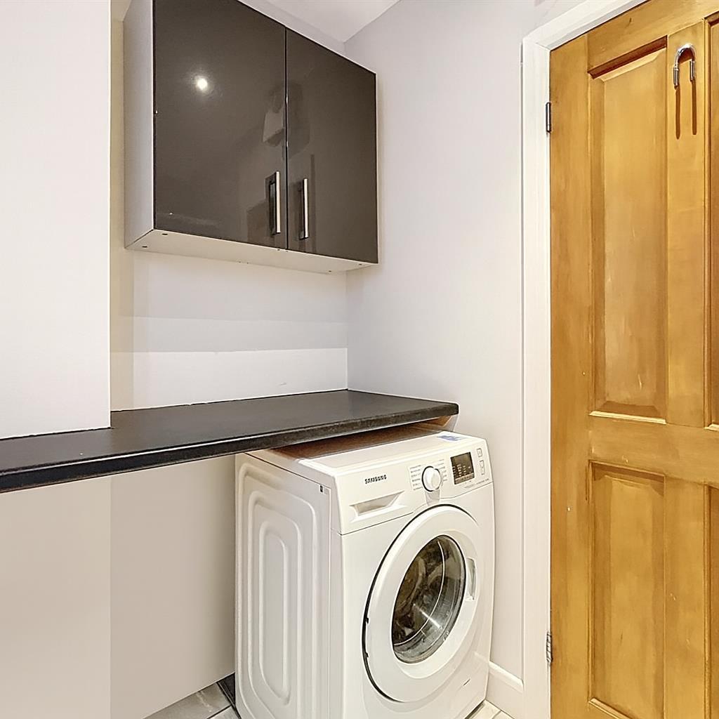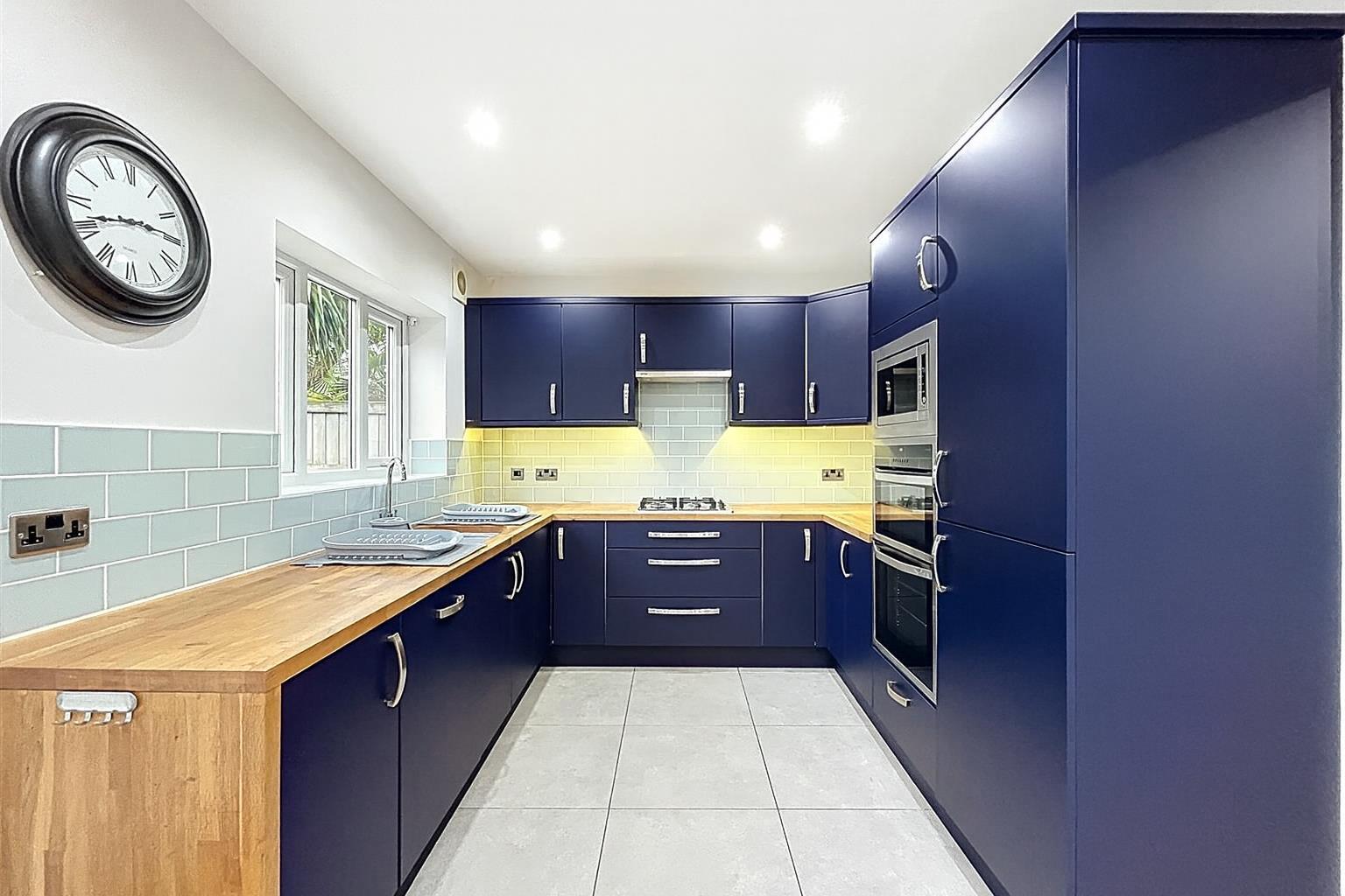 Fitted with high-gloss base and wall units with drawers. Feature oak block work surfaces with integrated 1 ½ bowl stainless steel sink unit with mixer tap, integrated appliances comprise automatic dishwasher, four ring brushed steel hob with illuminated cooker filter above, double electric fan oven and grill with microwave above and cupboards above and below, integrated refrigerator and freezer, LED downlighting, extractor fan, window overlooking the rear garden with roller blind.