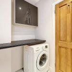 Ceramic tiled floor with ceramic tiling to walls, quadrant corner shower cubicle with glazed screen doors and mains fed shower, wall hung wash hand basin with tile splashback and mirror above, low-level WC, extractor fan, utility area with Samsung automatic washing machine, work surface over, matching high-gloss grey double wall cupboards.