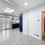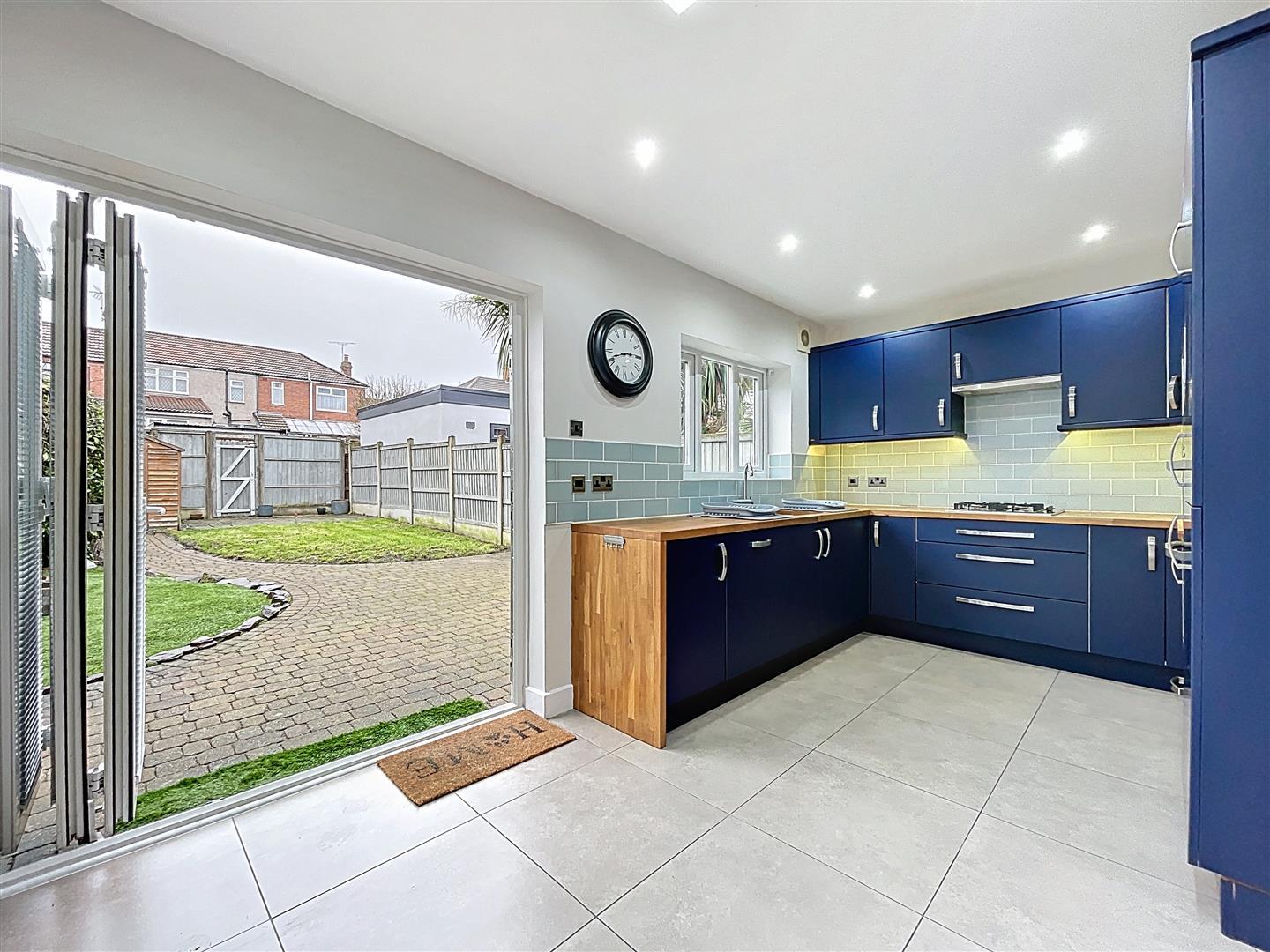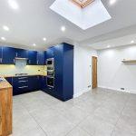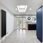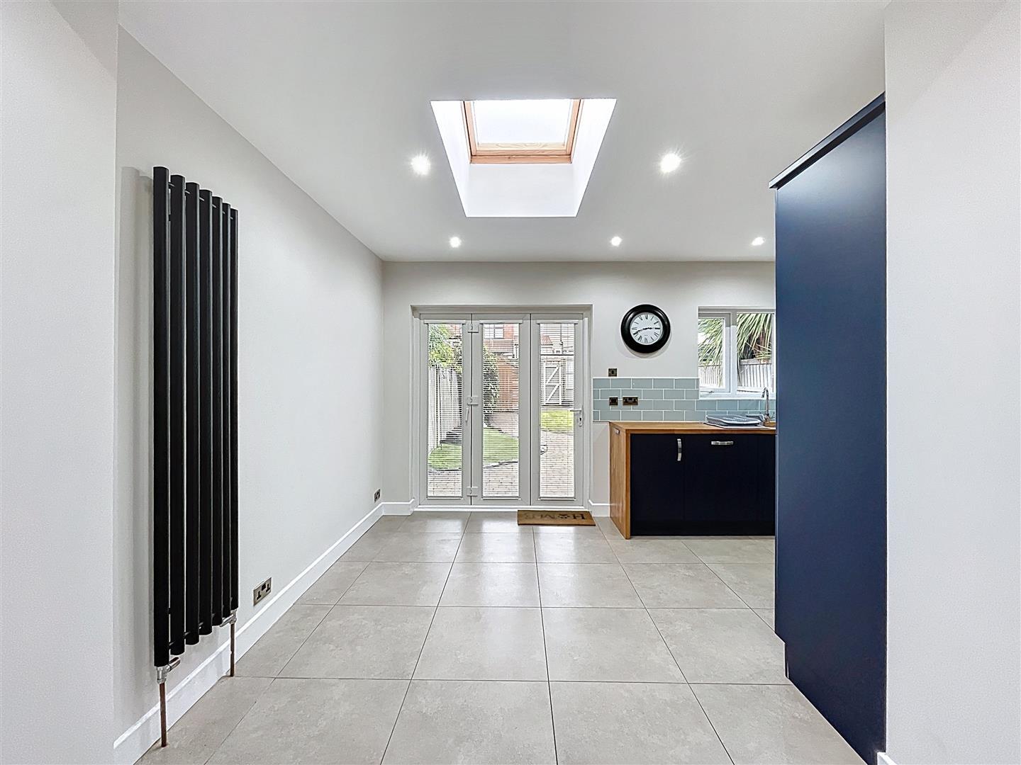 With trifold PVC doors opening to rear garden with integrated blinds, velux roof light, vertical radiator, LED downlighting.