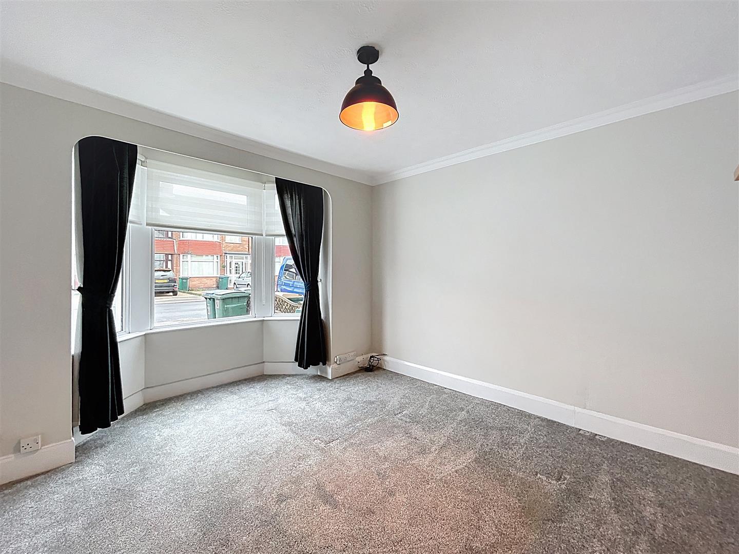 Into bay window with fitted blinds and curtains, fitted carpet, coving, TV aerial point, two wall shelves radiator, pine door to hall.