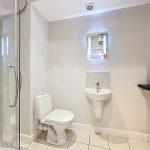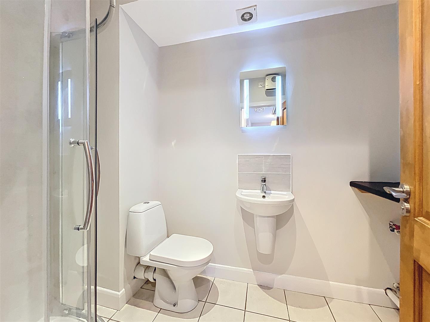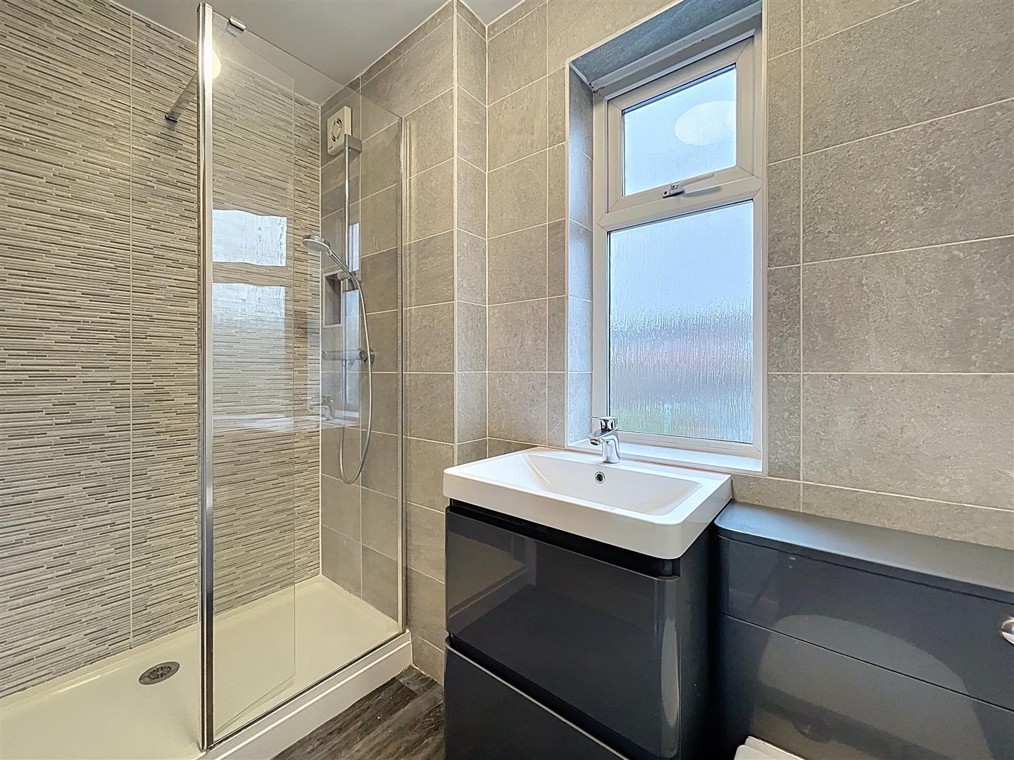 Refitted with large fully tiled shower with mains fed shower over, glazed shower screen with flip and drying area, vanity wash hand basin with two storage drawers beneath, recessed low-level WC with concealed cistern with easy close lid, extractor fan, vertical chrome heated towel warmer radiator, tiled flooring, mirror, LED light.