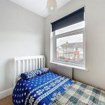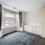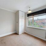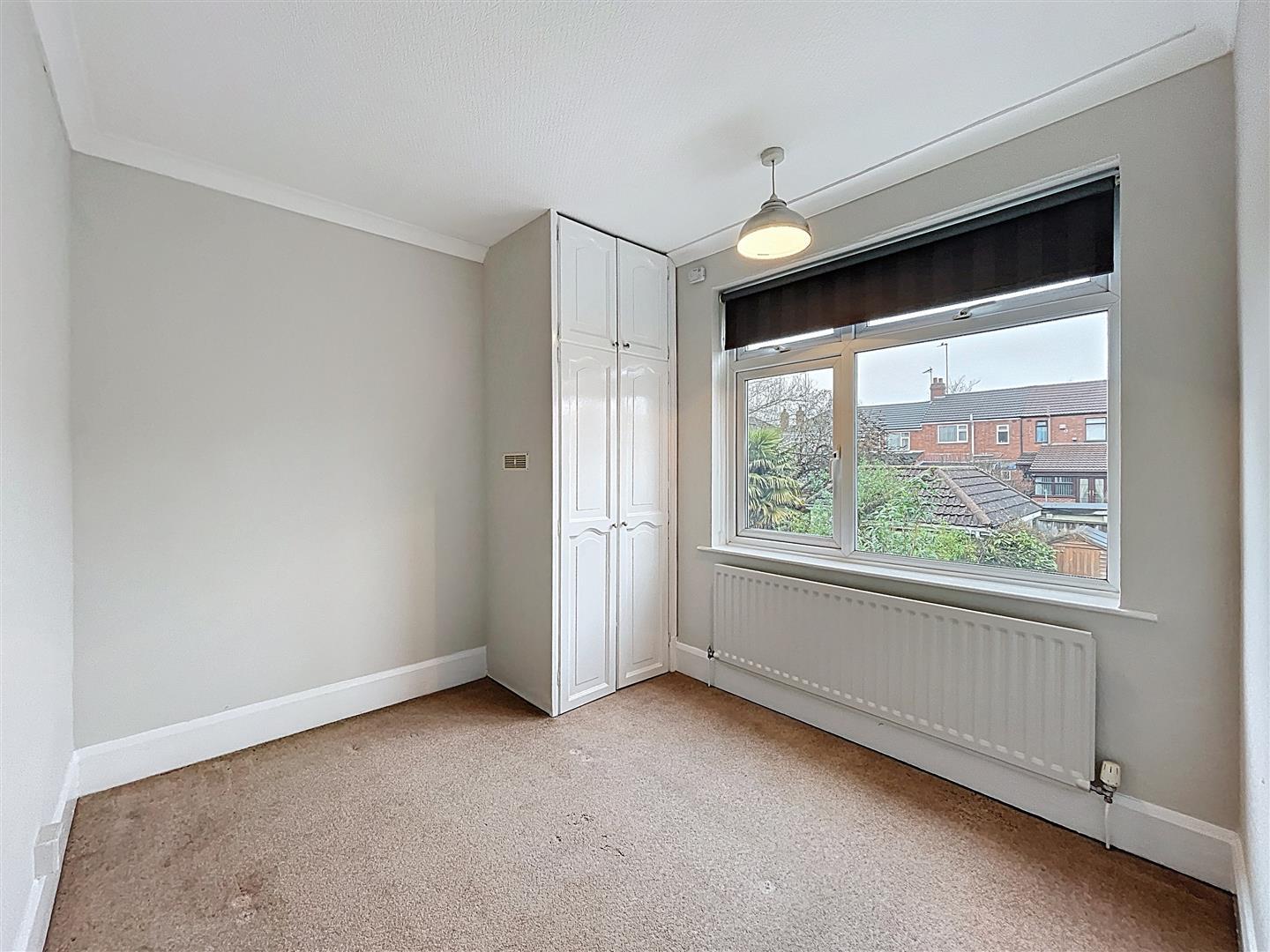 Fitted carpeting, roller blind, light fitment, double door built-in wardrobe cupboard housing Vaillant combination condensing gas fired boiler, together with hanging rail and shelf, radiator.