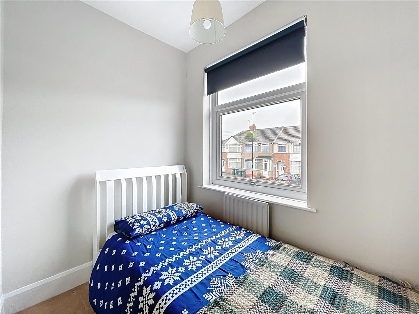 Fitted carpeting, radiator, blind, light shade.