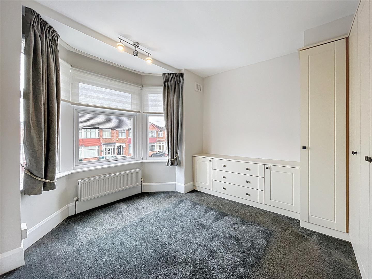 Fitted furniture comprising four-door wardrobe cupboards with full and half length hanging, three drawer chest with twin storage cupboards to sides, further storage cupboard, light fitment, coving, radiator, blinds and curtains to window.