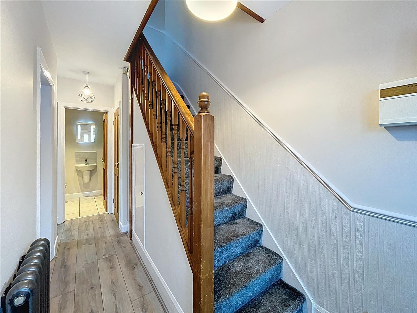 Wood laminate in entrance with carpeting beyond to hall, stairs and landing, radiator, under stairs storage cupboard, further large cloaks cupboard, burglar alarm, light fittings, and pine panelled doors .