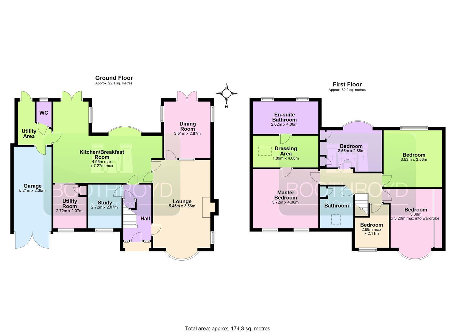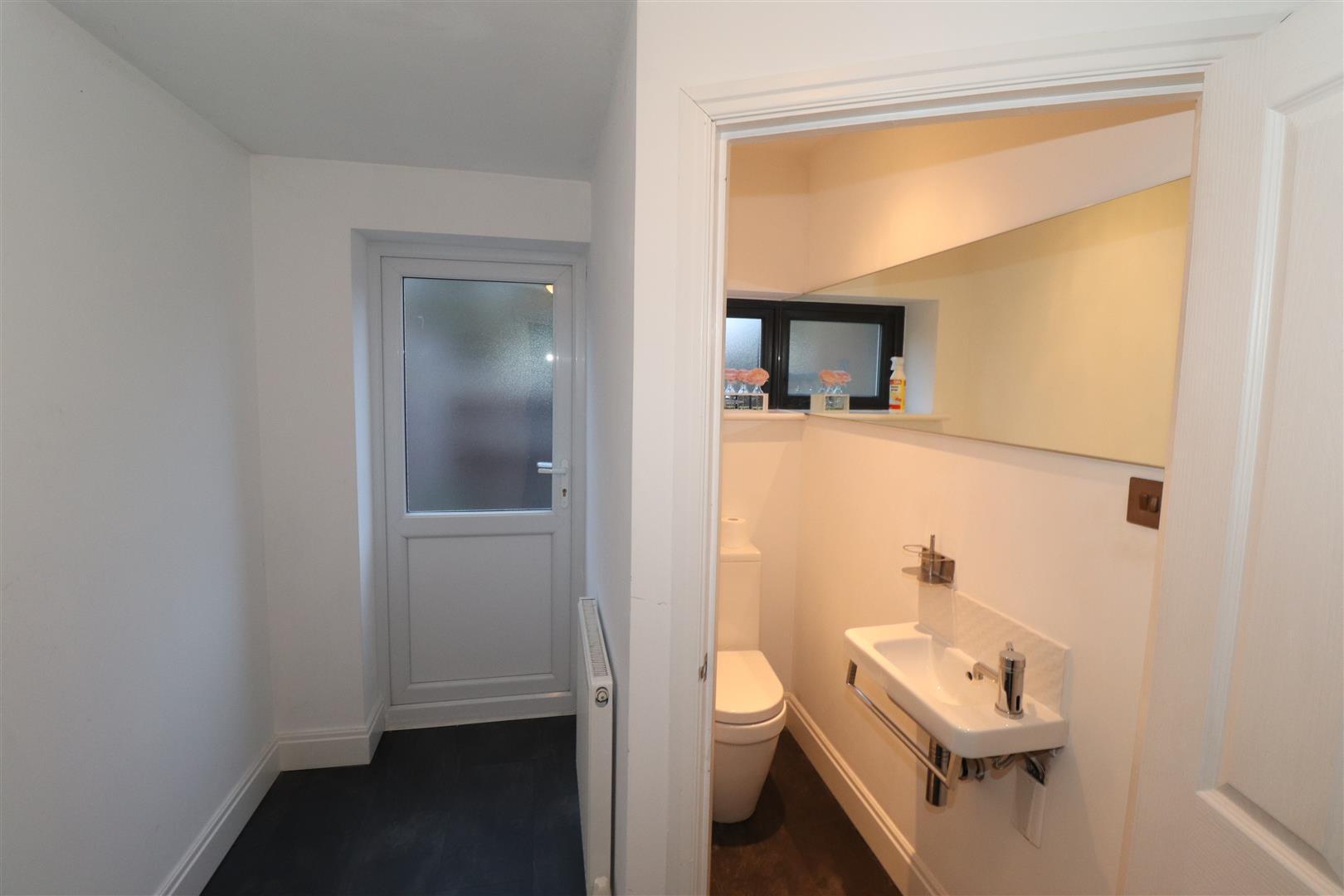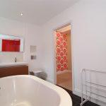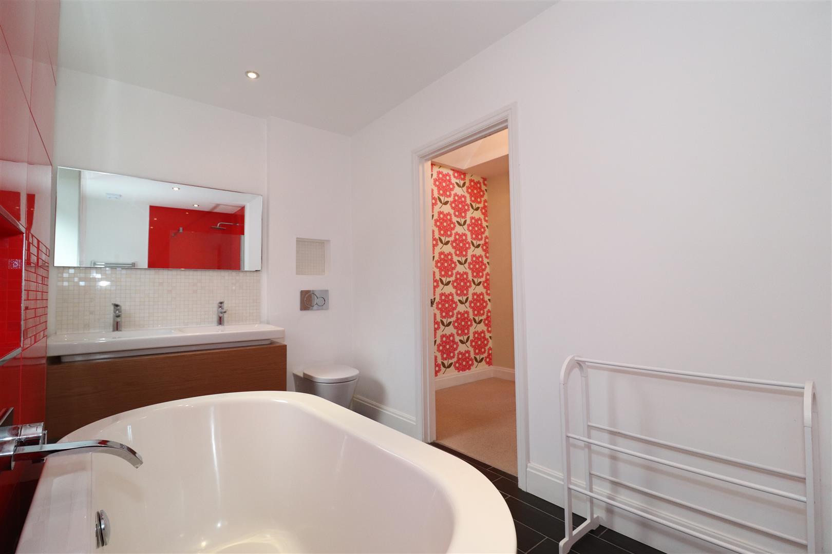With underfloor heating, a freestanding bath with waterfall tap, concealed cistern wc, wall hung his and hers vanity sinks and a walk in shower cubicle with a thermostatic rainfall shower. Tiled floors and splashbacks. Downlighting and twin frosted double glazed windows to the rear.