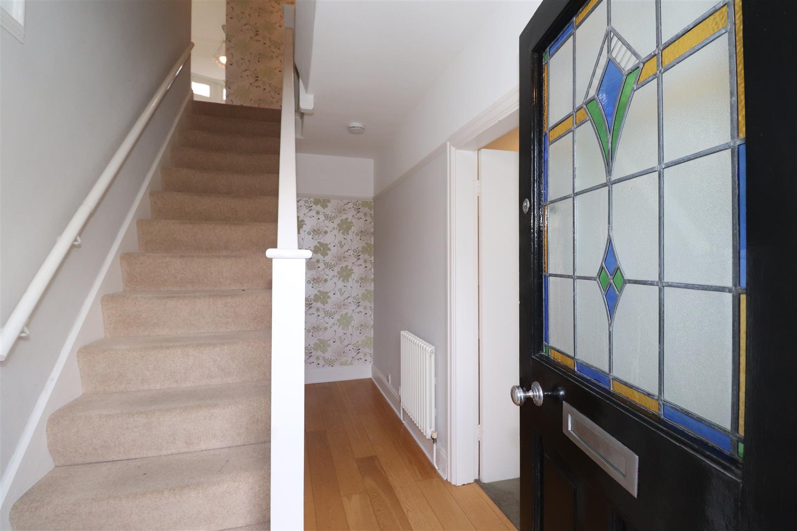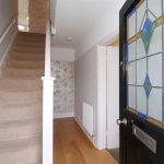 With a staircase rising to the first floor landing, engineered wood flooring, radiator, picture rails and and doors off to
