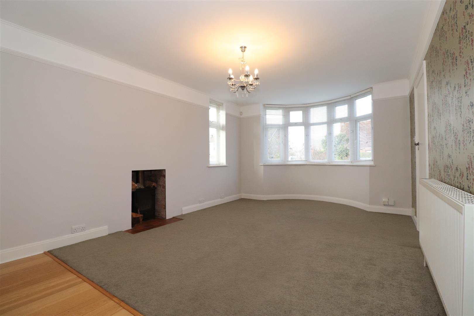 With a double glazed bay window to the fore, further double glazed window onto the side garden. Radiator, picture rails and a focal point provided by a fireplace set on a tiled hearth. Door into the dining room and double doors into the kitchen.