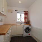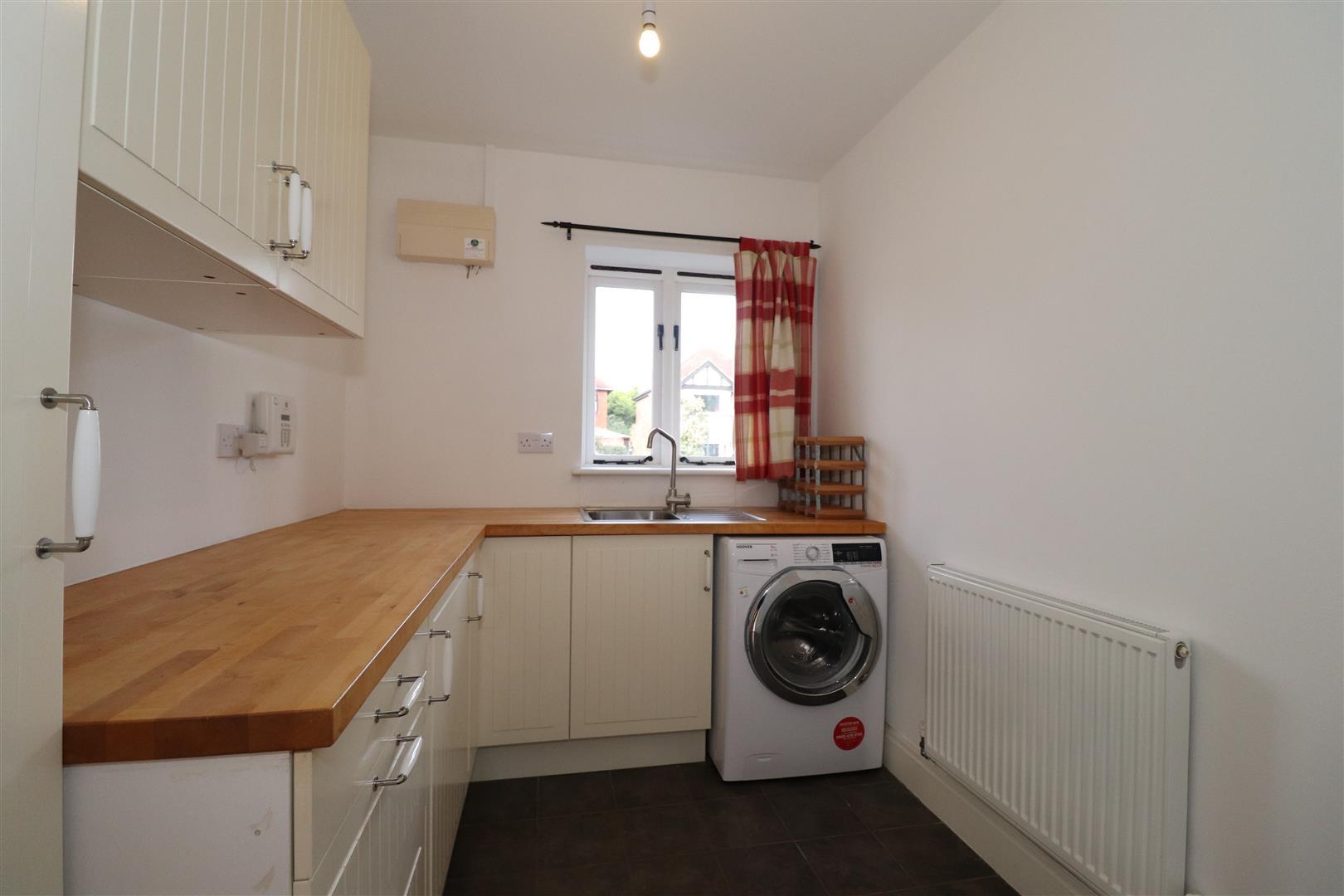 Further shaker style wall and base units with a wood block work surface. Inset stainless steel sink unit set beneath the double glazed window to the fore. Pantry unit, integrated fridge and a washing machine. Tiled flooring and a radiator.