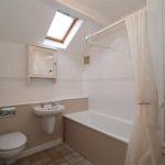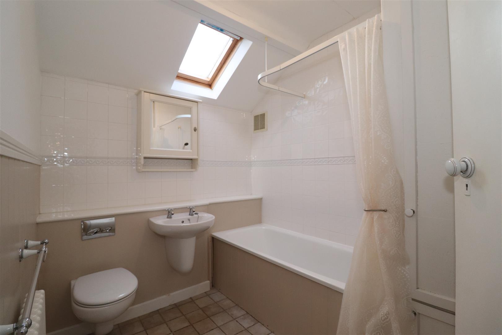 Fitted with a white suite that comprises a cast iron bath with mixer shower, half pedestal wash hand basin and a wall hung WCA's. Radiator, part wood panelling and tiled floor and splashbacks. Medicine cabinet and a velux window.