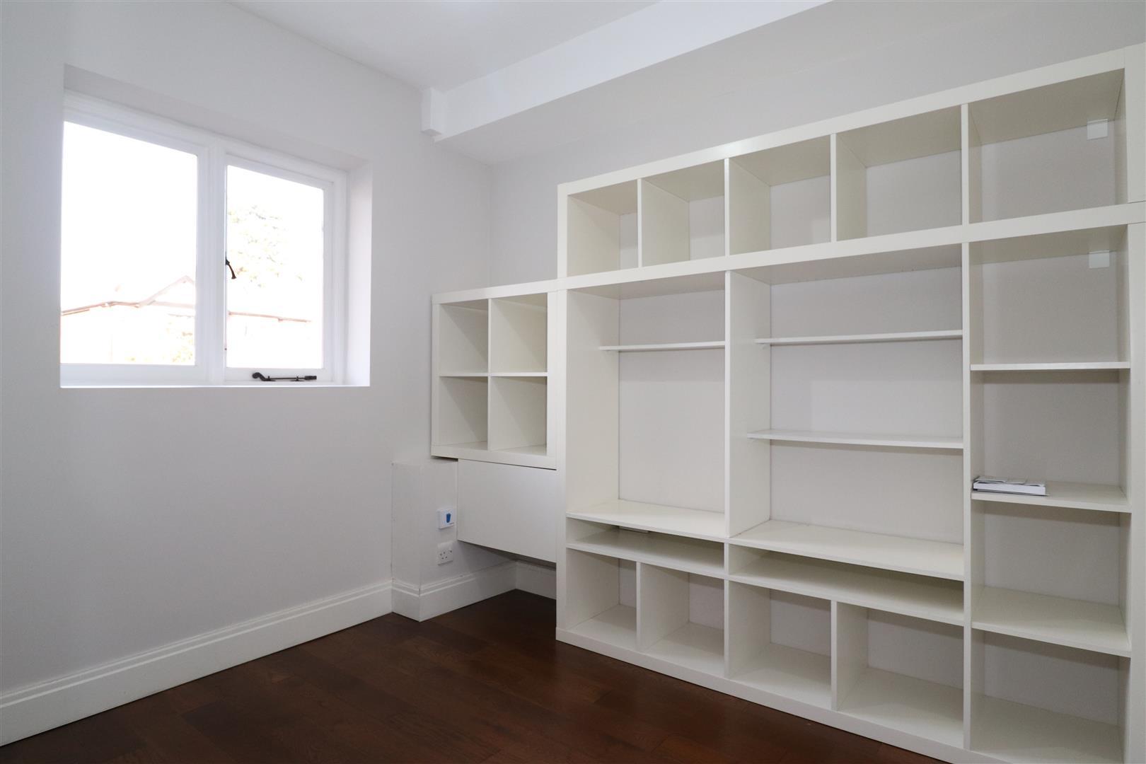 Double glazed window to the fore, laminate flooring, radiator and a bookcase.