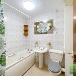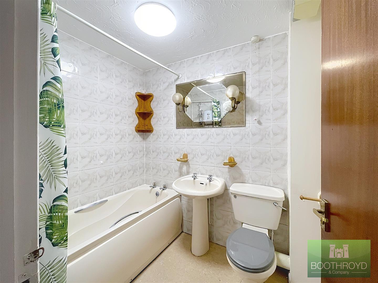 Having a close coupled wc, pedestal wash hand basin and a panelled bath with shower over. Tiling to splashbacks.