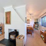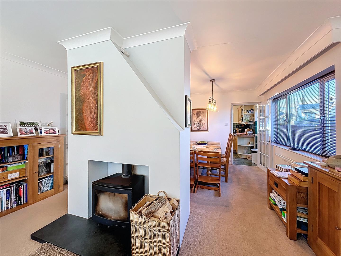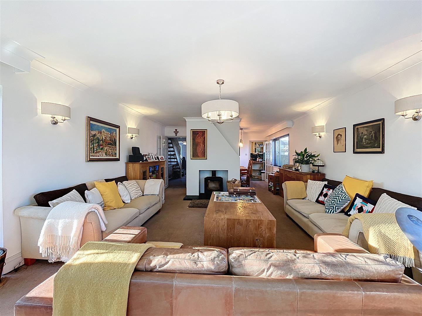 The room is spacious and features a wood-burning stove set into the chimney breast, complete with a granite-tiled hearth. It is equipped with four wall light fixtures, a ceiling light, coving, and radiators. There is a window on one side, as well as French doors that lead outside, which match the windows.