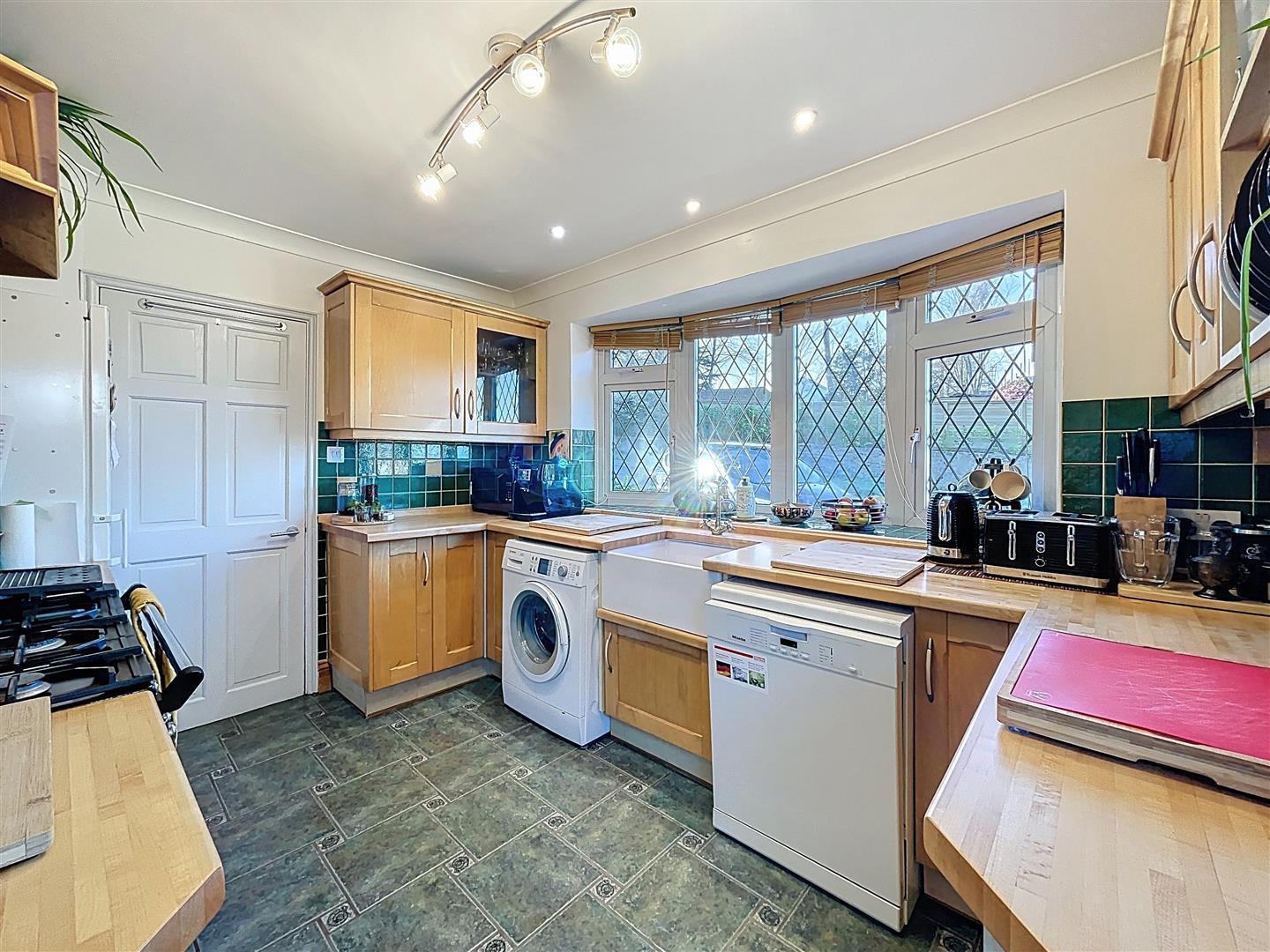 This kitchen features a variety of solid wood fronted base and wall units, complemented by matching wood block work surfaces. There is ceramic tiling on the splashback and a Belfast sink with a brass mixer tap. The space is designed to accommodate a range-style cooker, which is complemented by a concealed illuminated extractor hood above. Additionally, there is space and plumbing for a washing machine and dishwasher, as well as room for a large upright fridge freezer. The kitchen includes a leaded bow window at the front, ceramic tiling on the floor, coving details, a ceiling light, downlighters, an opaque window to the side, and a multi-paned door leading to the outside.
