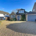 Over a gravelled driveway with space for 2/3 cars to a hardwood front door with windows on either side into the
