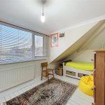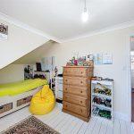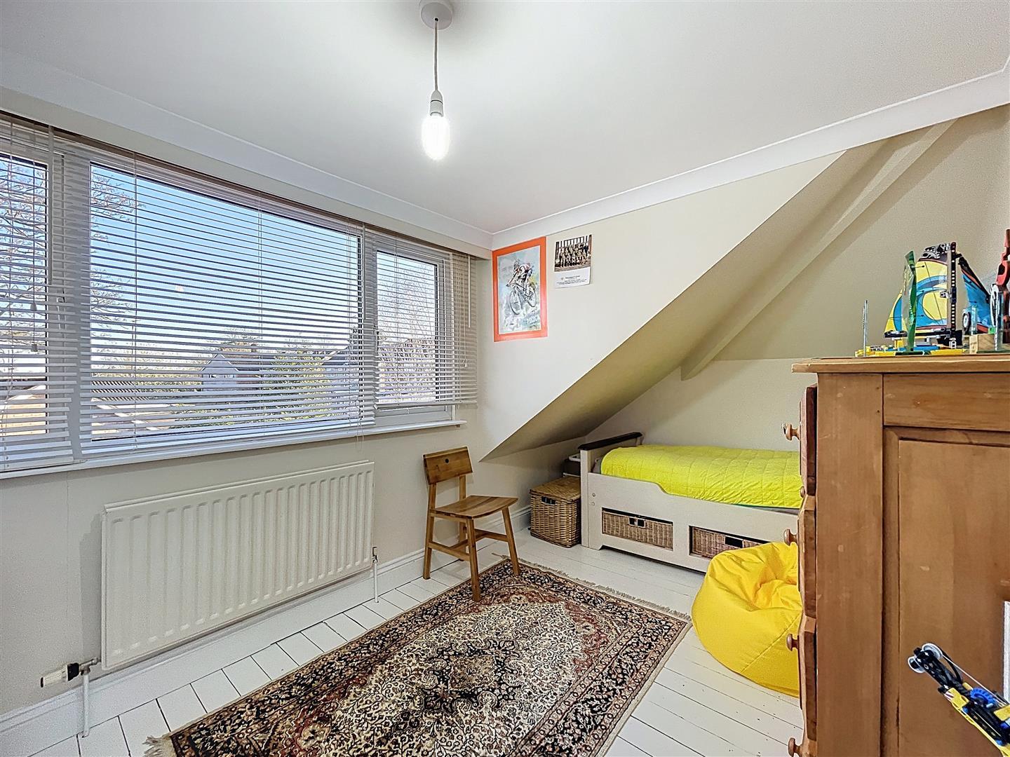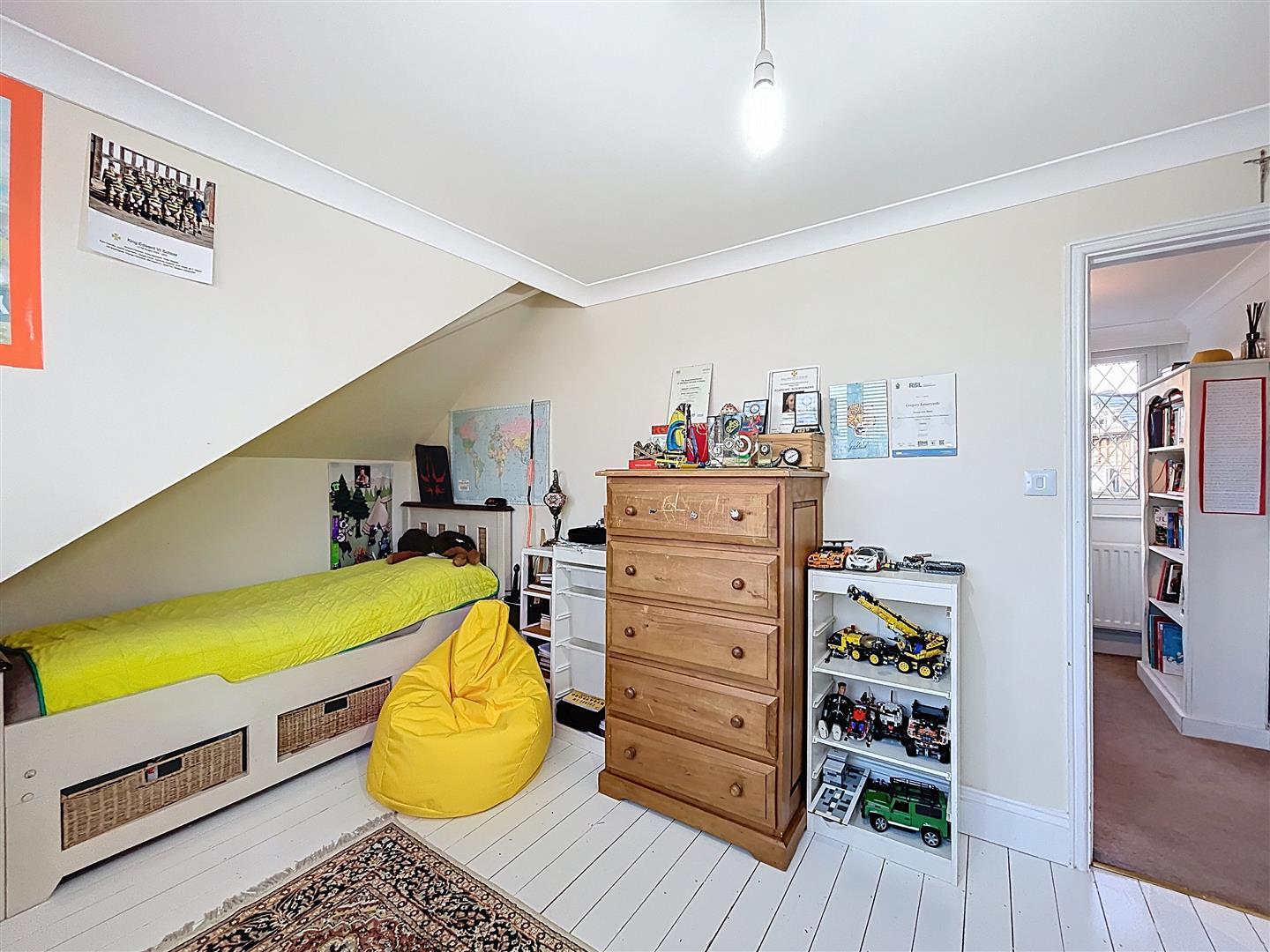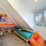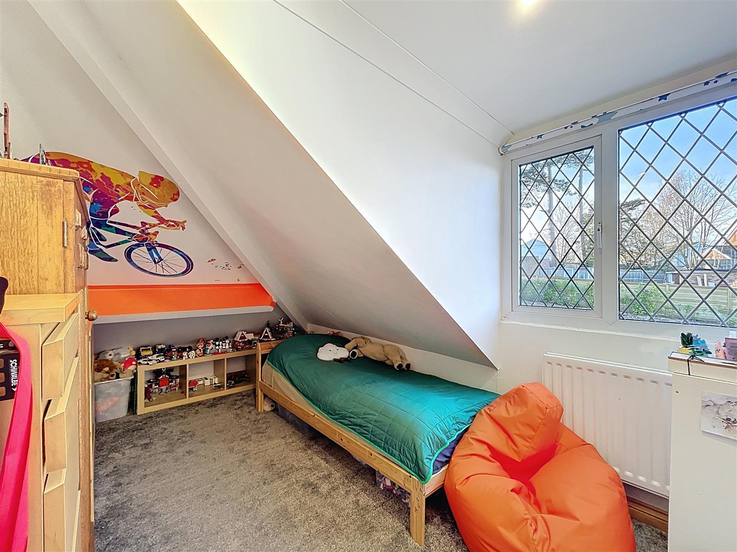 Due to a ceiling height restriction, the room features a ceiling light, radiator, coving, aerial point, and a dormer window at the rear. The floor has painted timber boards.