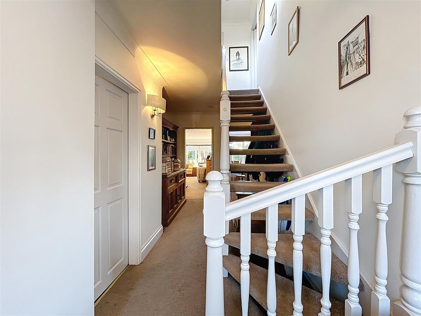 With an inset mat well and a leaded window to the side, the room features coving, a ceiling light, and open tread stairs rising to the first floor. It also includes a radiator, two wall lights, a smoke alarm, and a door leading to the