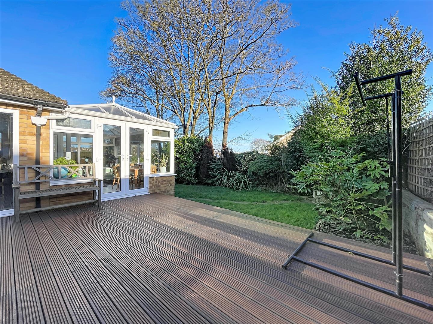 Fully enclosed by perimeter fencing and screening hedges with new large decked sitting area, with mains LED up lighters. There is a timber and glazed summerhouse with power and light, side gated access to the front.
