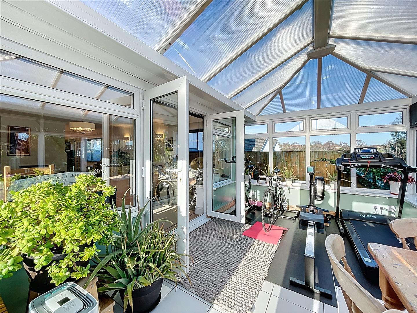 Featuring a pitched polycarbonate roof, two wall lights, ceramic tiling on the floor with underfloor heating, two aerial points, surrounding windows overlooking the rear garden, and French doors opening onto the patio.