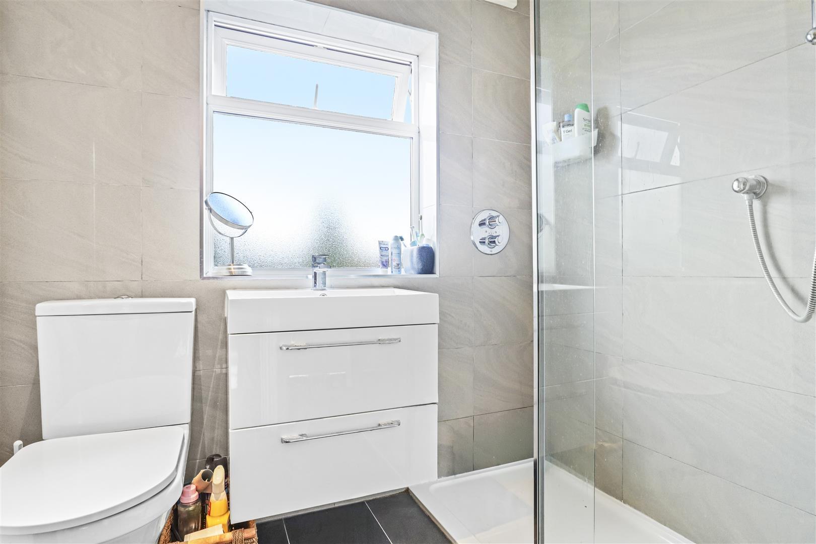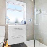 Three-piece white suite comprising a low-level WC, wall-mounted wash hand basin with chrome mixer tap and drawers below, a spacious walk-in mains-fed shower enclosure with chrome shower attachments. The walls are finished with full height ceramic tiles, complemented by LTV flooring. Further features include a frosted double-glazed window to the rear, LED downlighters and an extractor fan.