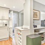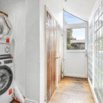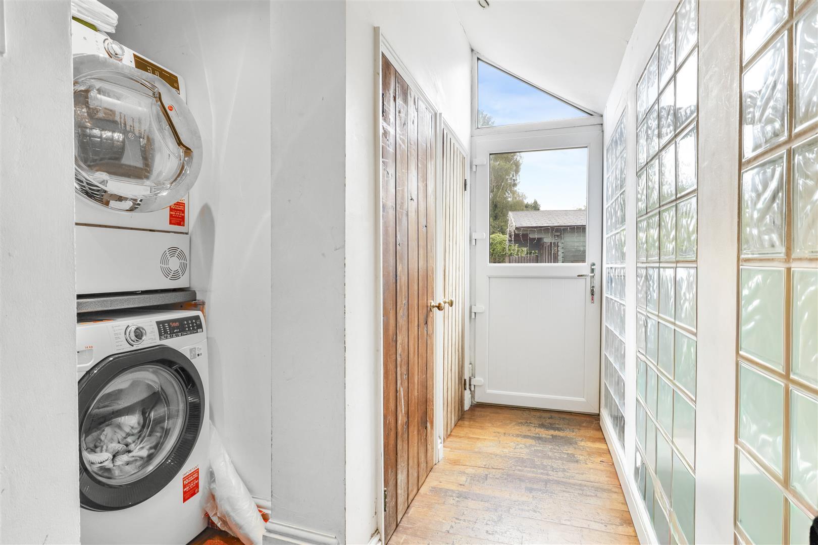 A practical utility area designed with space for a washing machine and a dryer featuring a glazed internal side wall allowing borrowed light, with access to shared courtyard thought a upvc double glazed door with glass inset with further storage area and a low-level WC with opaque glazed window.