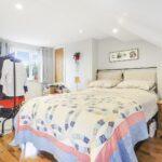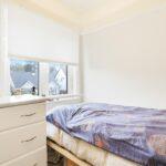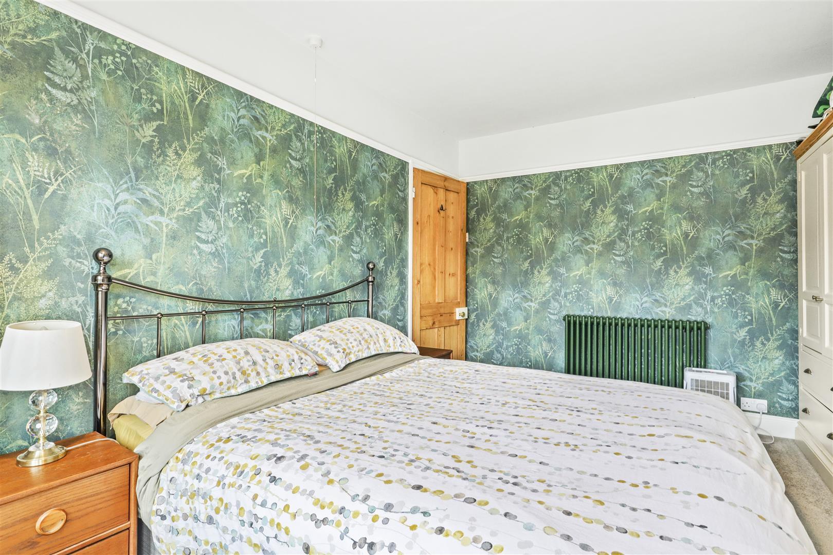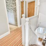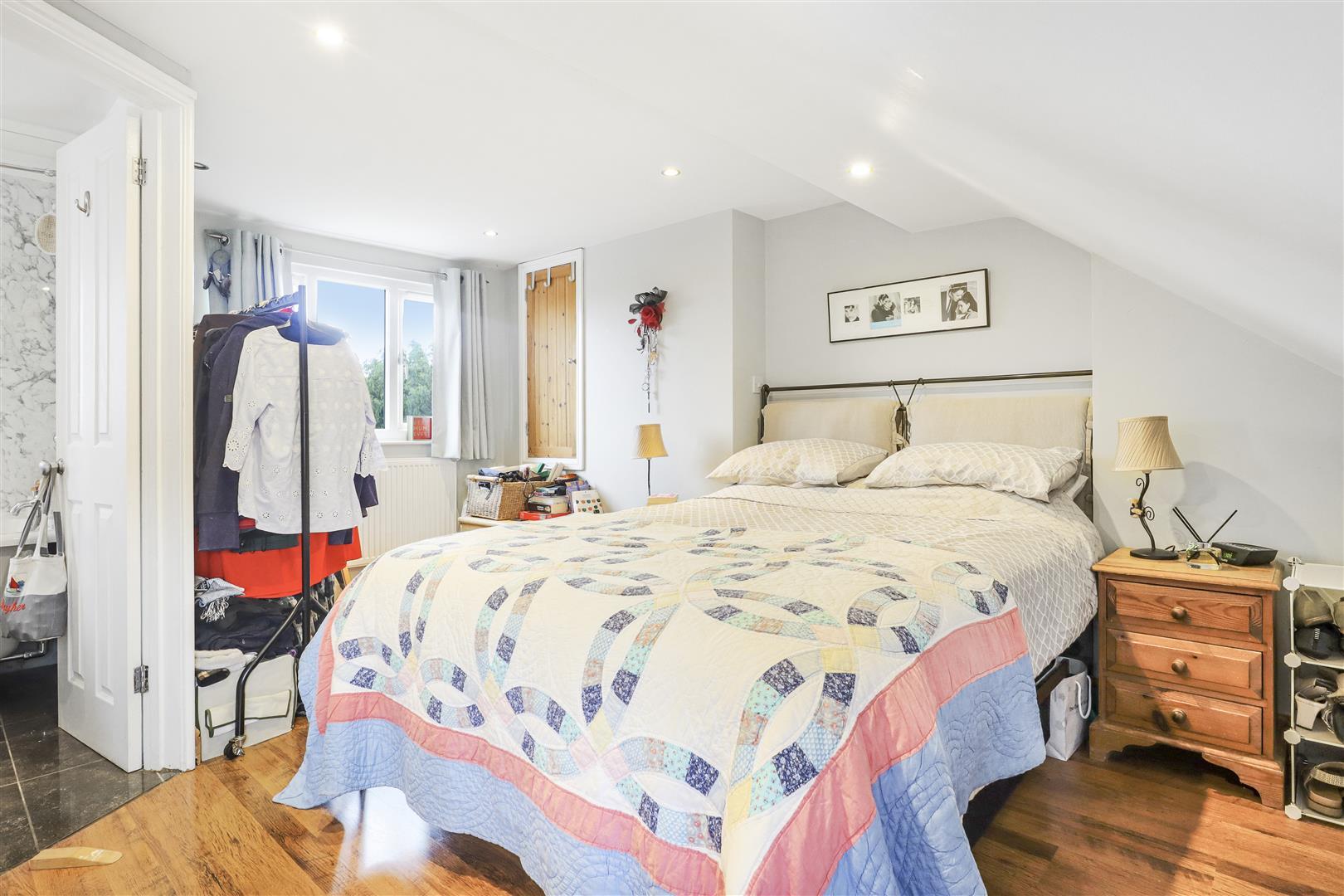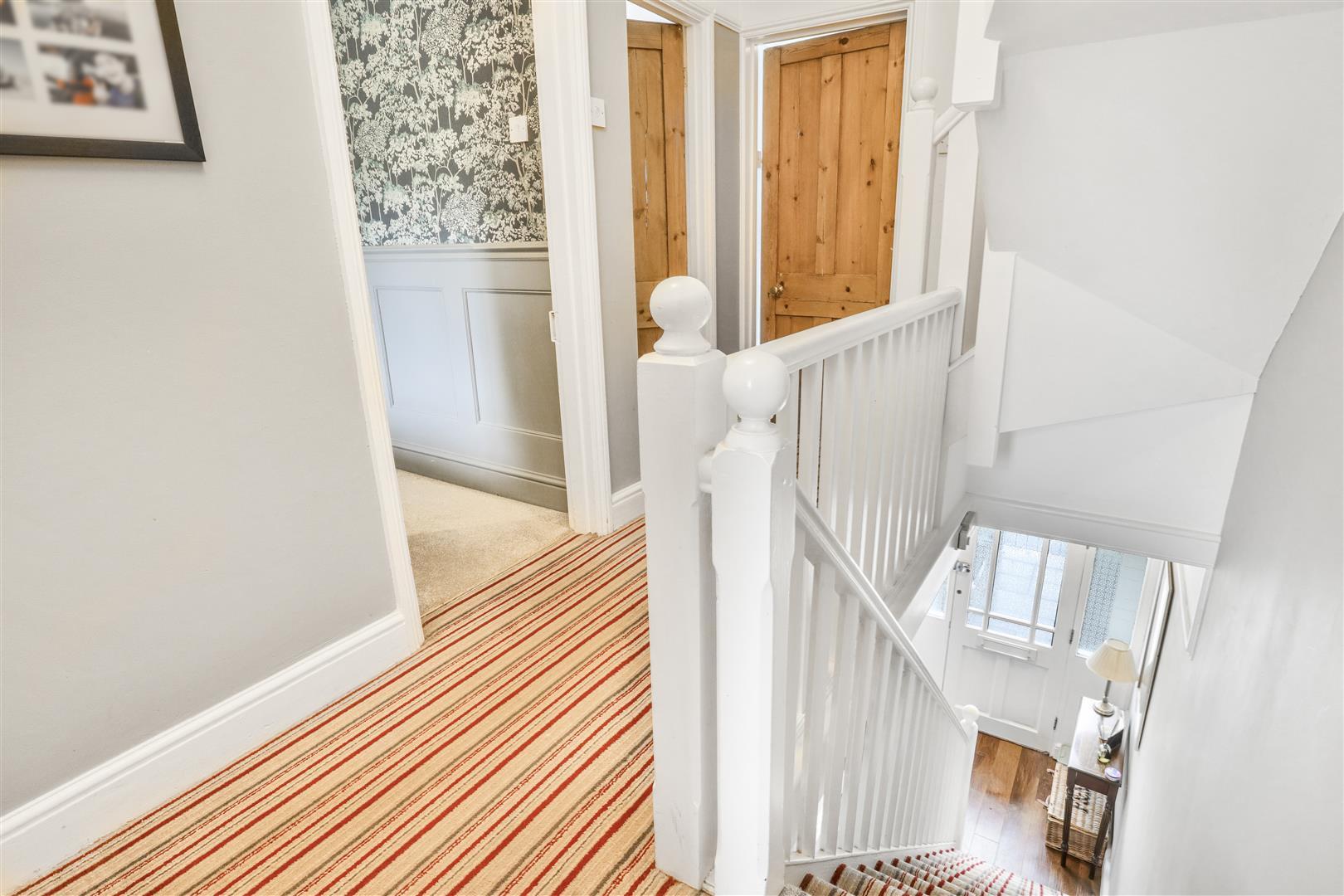 Stairs leading up to the top floor bedroom with recessed height, skylight, containing eaves storage, LED downlighters, rear window offering fantastic views with radiator below, storage cupboard housing the three-year-old Valiant boiler with door into