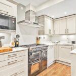 Comprehensively fitted with a range of quality shaker-style base and wall units, complemented by Treviso quartz work surfaces with matching upstands with pelmet lighting. Integrated appliances include a Richmond Stove with five gas fire ring hob with splashback and illuminated extractor above, eye-level Bosch microwave, Bosch dishwasher and fridge/freezer. There is an inset sink with matching chrome mixer tap and lighting is provided by two pendant lights and LED downlights.