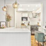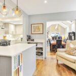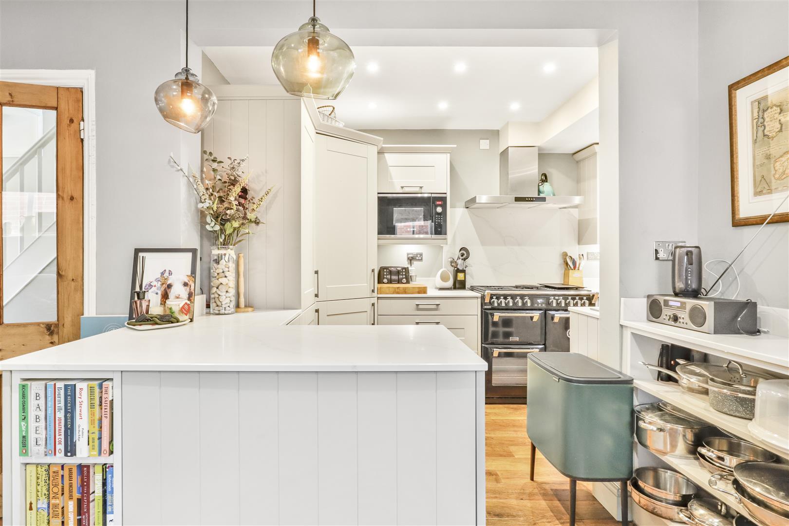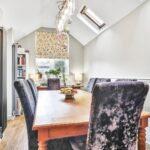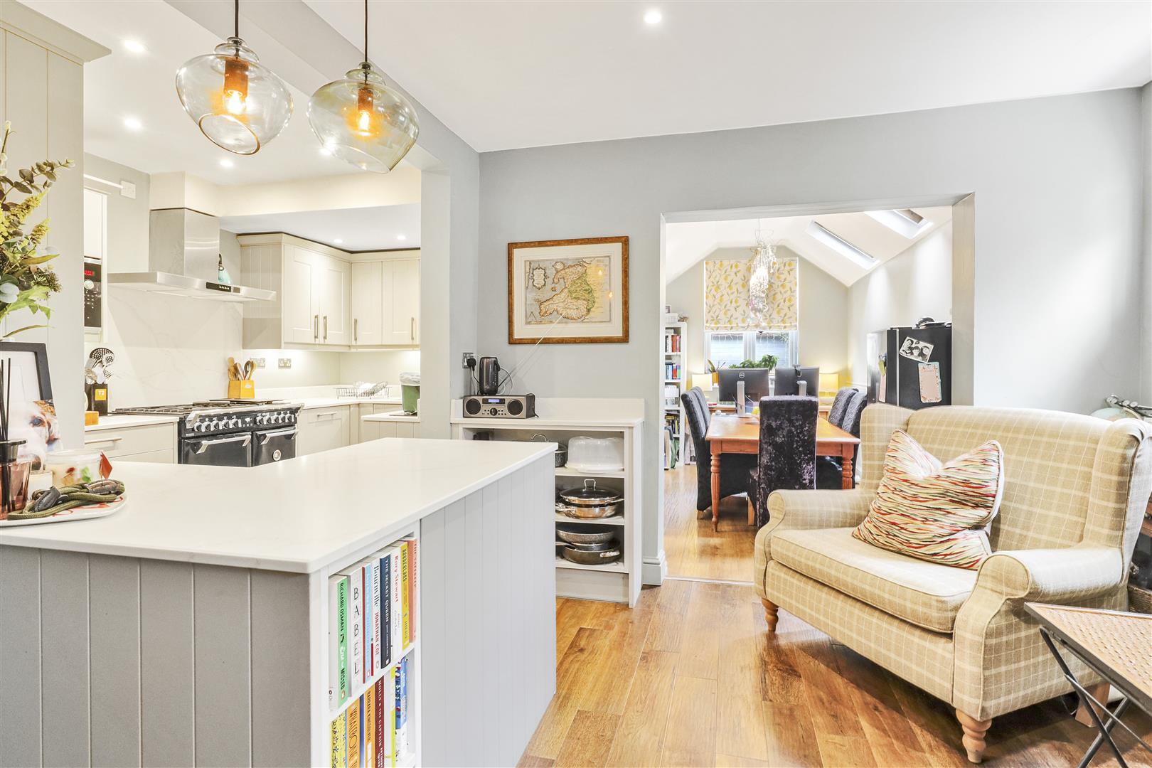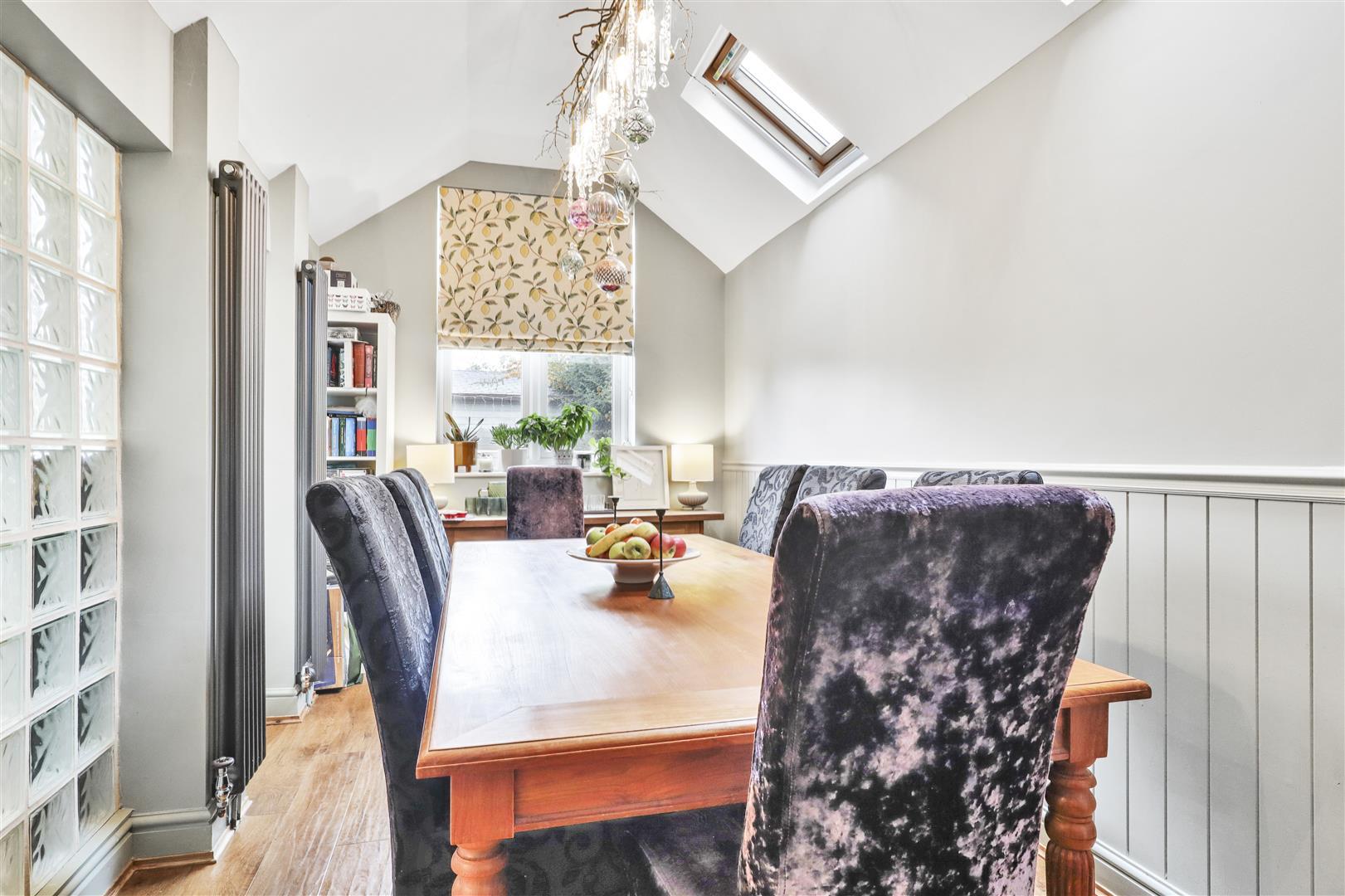 Through a square arch into the extended dining room with space for a large table and chairs with natural light being provided by two skylights, rear window and borrowed light from opaque glass block walls. There is timber panelling, dual vertical radiators and a statement light fitting.