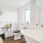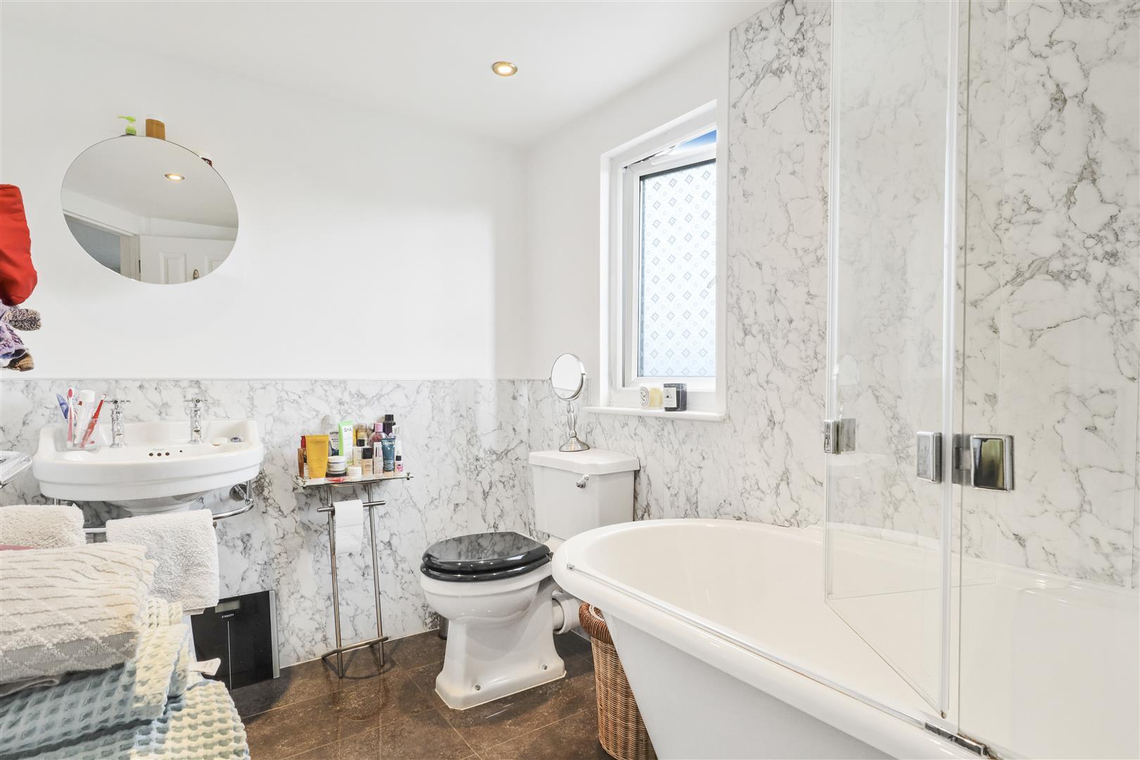 A well-appointed contemporary style modern suite with a Burlington pedestal wash hand basin with chrome attachments, column-style radiator, rear opaque glazed window, ceramic tiling to floor with low level WC, clawfoot bath with mains fed shower over with glass panel shower screen. Marble effect wall panelling with LED downlighters and opaque glazed window to rear.