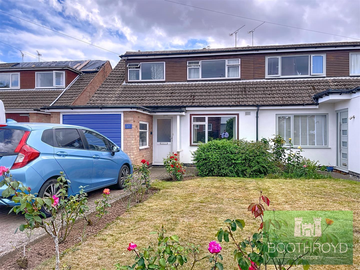 The attractive front garden has an area of lawn with shrubbery borders.